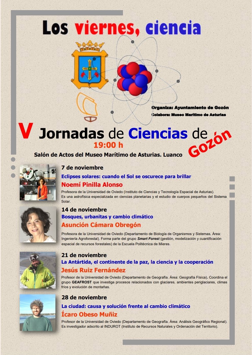 Este noviembre, el Ayuntamiento de Gozón y el Museo Marítimo de Asturias nos invitan a reconectar con el asombro, la curiosidad y el bienestar a través de la ciencia. Las V Jornadas de Ciencias de Gozón nos traen tres charlas que no solo iluminan temas clave del presente —como el cambio climático, los eclipses o el papel del conocimiento en la mejora ambiental— sino que también nos recuerdan que entender el mundo es una forma de cuidarnos emocionalmente.