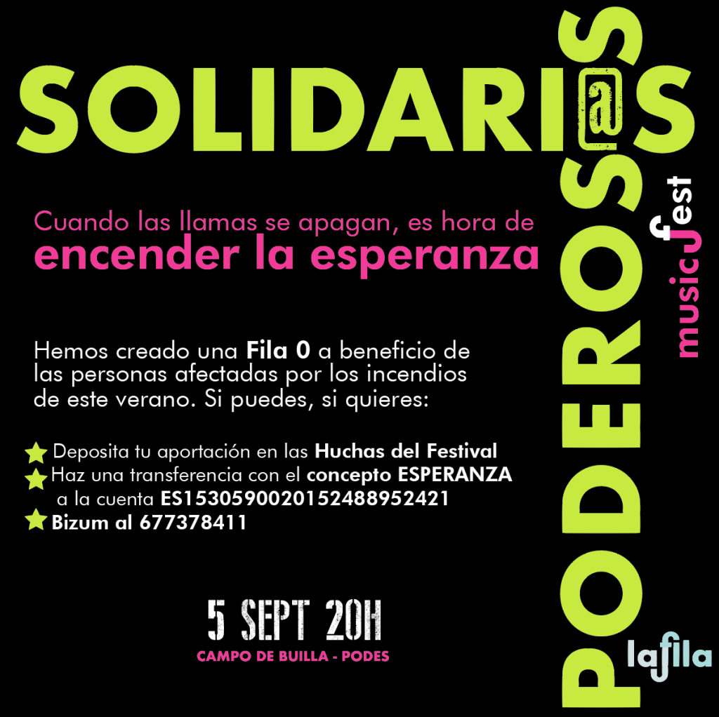Por eso, La Asociación de Vecinos La Fila, ha puesto en marcha una iniciativa solidaria vinculada a la primera edición del Poderos@s Music Fest, que se celebrará el 5 de septiembre a partir de las 20h en el Campo de Builla, en Podes. Aprovechando que los conciertos serán gratuitos hasta completar aforo se hace una llamada solidaria a la captación de fondos mediante UNA FILA CERO a beneficio de los más afectados por los incendios.