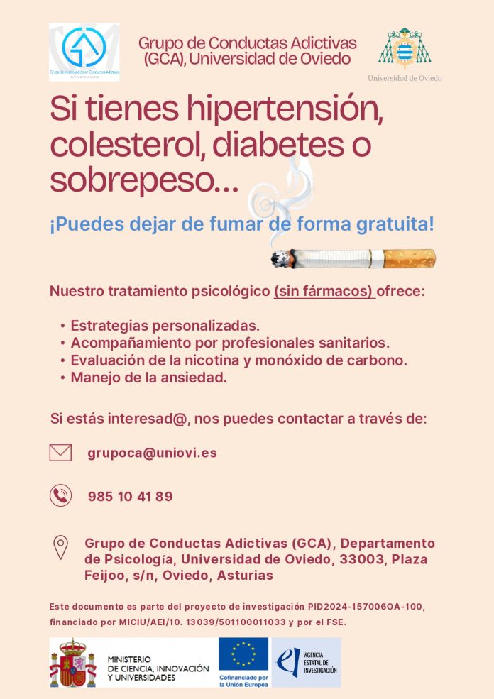 El Grupo de Conductas Adictivas (GCA) de la Universidad de Oviedo ha puesto en marcha un programa gratuito para dejar de fumar, especialmente pensado para personas con hipertensión, colesterol elevado, diabetes, sobrepeso u obesidad, que buscan mejorar su salud y abandonar el tabaco con apoyo profesional.