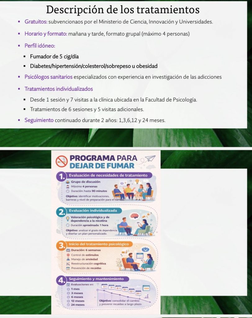 El tratamiento, financiado por el Ministerio de Ciencia, Innovación y Universidades y cofinanciado por la Unión Europea, se desarrolla en la Facultad de Psicología y está dirigido por psicólogos sanitarios especializados en adicciones. Se trata de una intervención sin fármacos, basada en estrategias psicológicas que han demostrado eficacia en la deshabituación tabáquica.